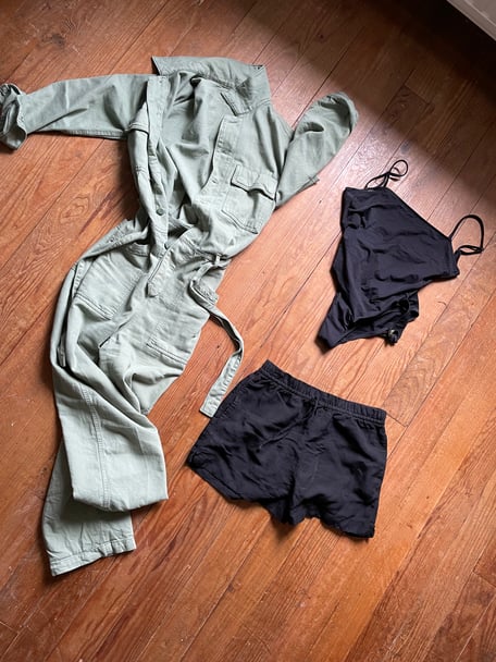 写真の洋服は77歳マダムからのお古。。。水着、つなぎ。